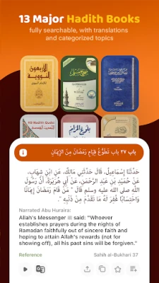 Utöver Koranstudier erbjuder appen en omfattande Hadithsamling med 13 stora böcker, alla med arabisk text och översättningar, samt sökfunktion. Den inkluderar en vägledning för Hajj och Umrah med detaljerade instruktioner och information om historiska platser. En exakt Zakat-kalkylator, en islamisk Hijri-kalender med viktiga händelser och möjligheten att konvertera datum finns också tillgängliga. För din bekvämlighet kan du även hitta islamiska platser i närheten, såsom moskéer och halala restauranger, och till och med se livestream från Mecka och Medina. Upplev en komplett lösning för din andliga och praktiska muslimska vardag, utvecklad av Muslim and Quran.