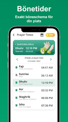 Bönetider, Azan alarm, Qibla är appen Muslimmer, din kompletta muslimska följeslagare. Få exakta bönetider baserade på din plats och Azan-alarm med olika muezzinröster. Använd Qibla-kompassen, läs Koranen och dagliga Dua. Ett oumbärligt verktyg för resande muslimer som vill följa islamiska traditioner och alltid ha en pålitlig Mecka-finnare till hands.